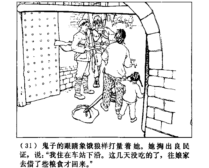 鬼子の目は飢えた狼のように彼女をジロジロみていた。芳林嫂は良民証をとりだすと、