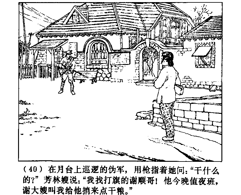 プラットホームを巡邏していた偽軍兵士が銃を向けて芳林嫂にたずねた。