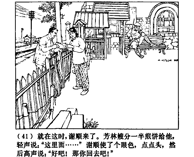 ちょうどそのとき、謝順がきた。芳林嫂はもっていた煎餅の半分を分けながら、こっそり