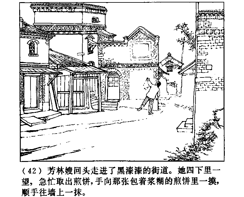 芳林嫂は真っ暗な通りをもどっていった。あるところであたりを一望すると、いそいで煎餅をとりだし、糊をつつんだあの煎餅のなかをひとかきすると、そのまま壁の上になすりつけた。
