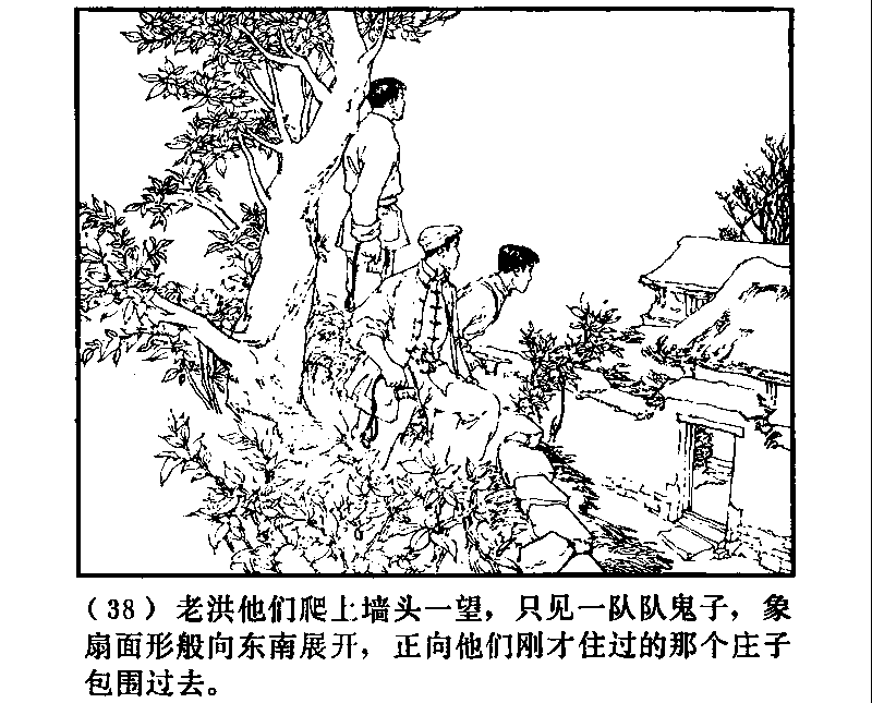 老洪たちが塀にのぼって一望すると、鬼子が一隊一隊東南方向へ扇形に展開しながら、さきほどまでいたあの村を包囲しようとしていた。