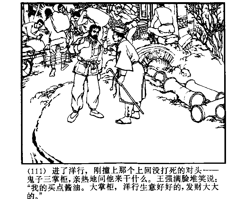 洋行にはいるとすぐに、あの殺しそこねたライバル -- 鬼子の三掌柜がいて、今なにをしているのか親しげに聞いてきた。王強は顔に笑いをたたえながら、「ワタシ醤油売っている。大掌柜、洋行の仕事ウマイウマイ、金儲けタクサンタクサン」