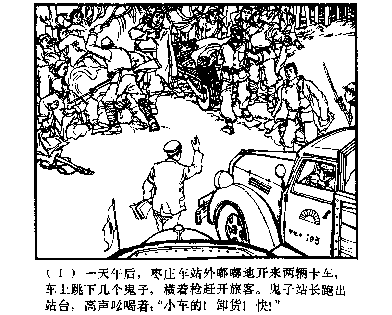 ある午後、棗荘駅より、ドドドとやってきた二台のトラックがあった。二人の鬼子がとびおりると、銃をよこたえ旅客をおしのけた。鬼子の駅長がプラットホームから走りでて、高い声でさけんだ。