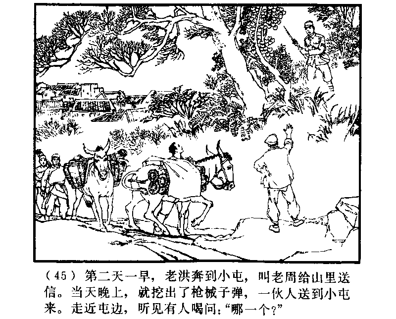 翌朝、老洪は小屯に急ぎ、老周にたのんで山へ手紙を出した。その夜、機関銃や弾を掘りだし、みんなで小屯へ送りとどけた。近くまでいくと、こう叫ぶ者がみえた「誰だ!」