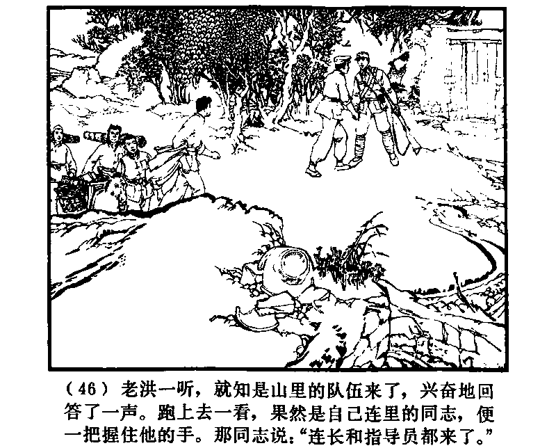 老洪がみると、それは山の部隊から来た者だった。興奮しつつ返事をし、走り上ってみれば、やっぱり自分の連(※)の同志だった。手をがっちり握ると、その同志「連長と指導員もきているよ」