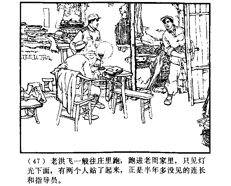 老洪は敷地内へ飛ぶように駆けていった。老周の家にはいると、あかりのもとに二人が立っていた。まさにこのふたりが、半年ほども会えずにいた連長と指導員だった。