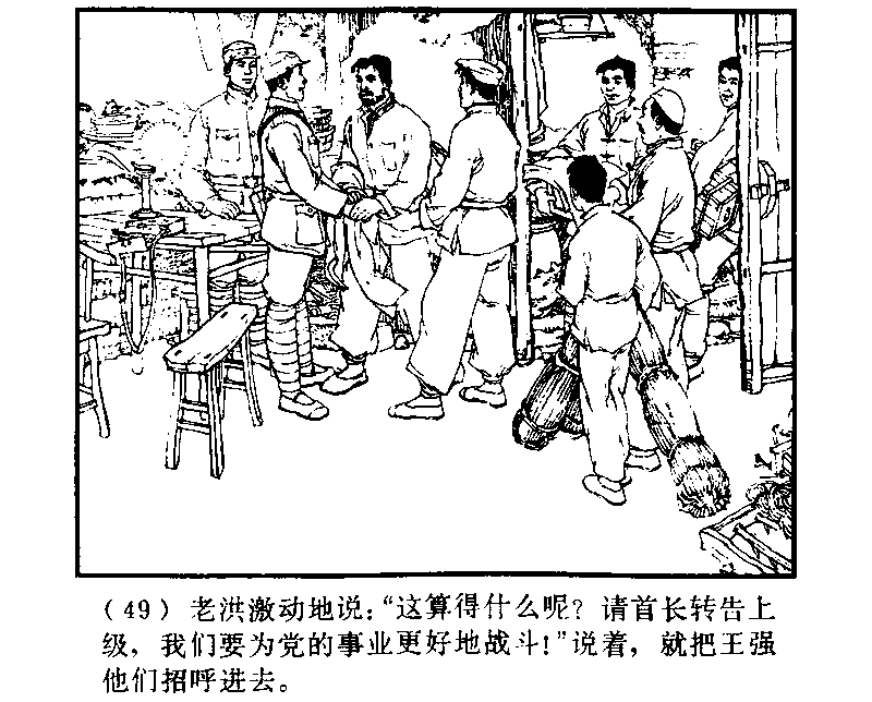 老洪は感動し、「これはどういうおつもりですか? 連長には上におつたえください。我々は党の事業のためより一層の戦闘をするつもりです!」そう言うと、王強にみんなを呼びいれるよう言った。