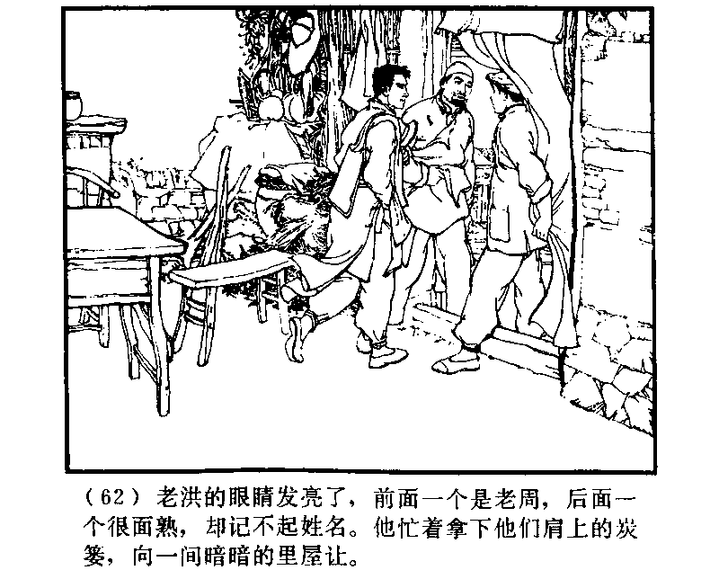 老洪の目は輝いた。前の一人は老周で、後の一人の顔はよくしっているが、名前がおもいだせない。あわてて二人の肩から炭カゴをおろし、中の暗い部屋に案内した。