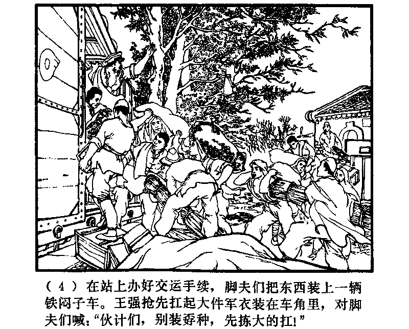 駅での手続きがすむと、人夫たちは荷物を有蓋貨車にのせかえようとした。王強はまっさきに軍服の大きなつつみをかつぎあげて車の隅に置くと、人夫たちに叫んだ。「おまえら、やくたたずとおもわれたくなかったら、まずでかいのをかつげ!」