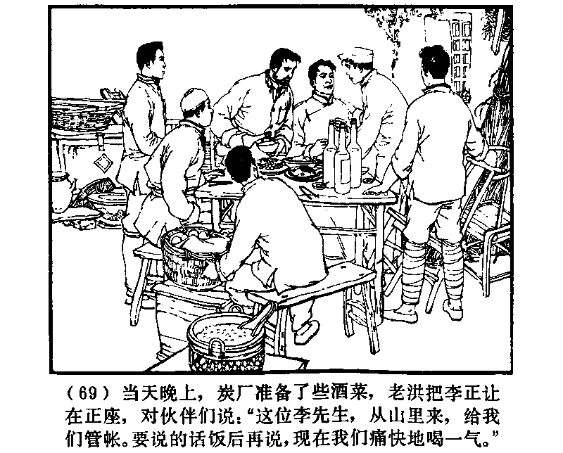 その夜、炭廠では酒と料理を用意し、老洪は李正を上座に迎えて仲間たちに言った。