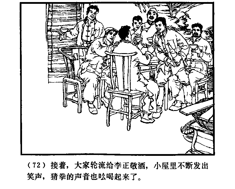 つづいて、みんなは続けさまに李正に酒をつぎにやってきた。小屋の中からはたえず笑い声がとびだし、猜拳の声も起こってきた。