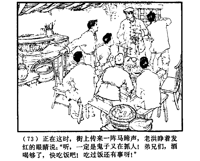 丁度そのとき、街のほうから一陣の蹄の音がきこえてきた。老洪は赤くなった目を丸くしながら、「聞け!きっと鬼子が人を捕まえにきているんだ。兄弟たち、酒を十分にのんで飯をさっさと食おう!食いおわったらまだやる事があるぞ!」