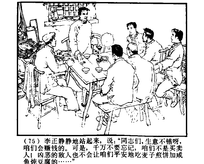 李正はしずかにたちあがると、「同志たち、この事業はすばらしい。きっとこれで金儲けできるだろう。しかし、絶対にわすれないでほしい。わたしたちは商売人ではない! 我々は平和裡に小麦粉の煎餅や乾し魚や豆腐煮込みを食べているが、凶悪な敵はきっとこのままにはさせてくれない...」
