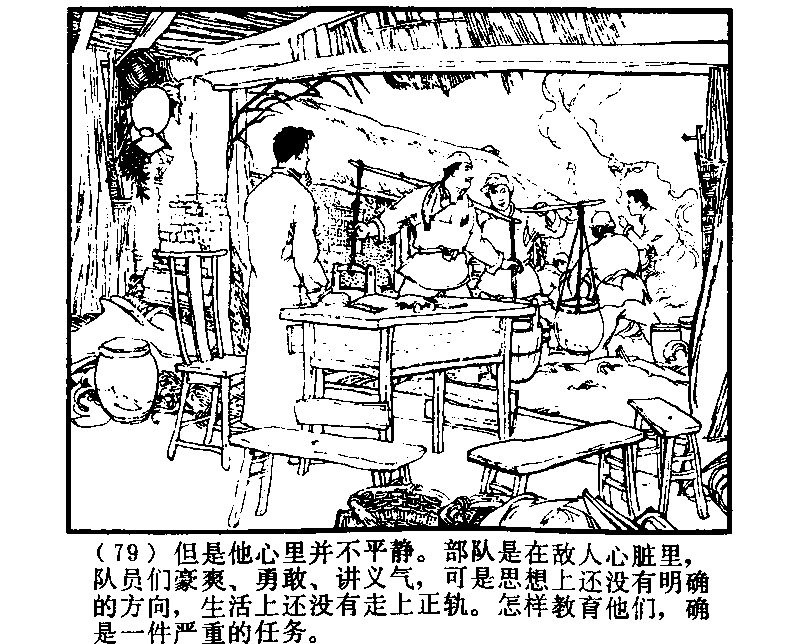 ただ、彼の心のうちは決しておだやかではなかった。この部隊は敵のまっただなかにあり、隊員たちは豪快で勇敢であり、義侠心にあついが、しかし思想面ではまだはっきりした方向がなく、生活面でも正しい軌道の上を走っているとはいえなかった。どうやって彼らを教育したものか。たしかになんとも重大な任務である。