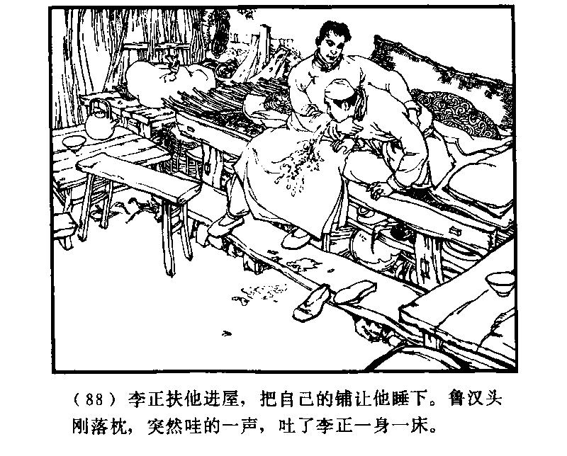 李正は魯漢をたすけて部屋の中にはいると、自分のベッドに寝かせた。魯漢の頭が枕からおちそうになり、突然ワッと言うと李正や床に吐きだした。