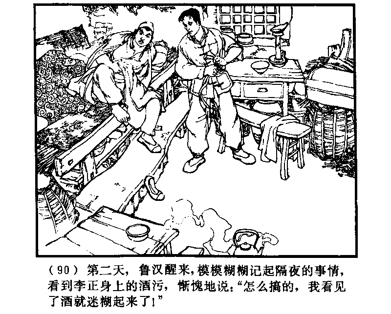 翌朝、魯漢は目を覚まし、昨夜のことをぼんやりとおもいだした。李正の服にゲロの跡があるのをみると、恥しげに言った「どうしたもんか、酒でバカなことをしでかしてしまった!」