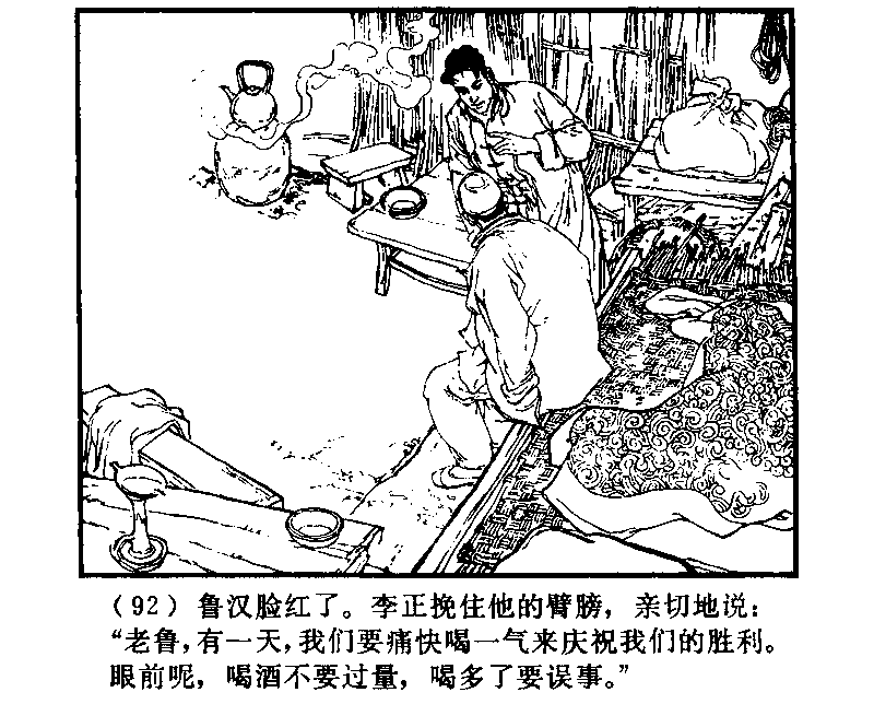 魯漢は顔が赤くなった。李正は彼の手をとり、あたたかく言った。「老魯、いつの日か、痛快に酒をのんで我々の勝利を祝おう。今のところは飲みすぎないようにしよう。飲みすぎると事を誤る。」