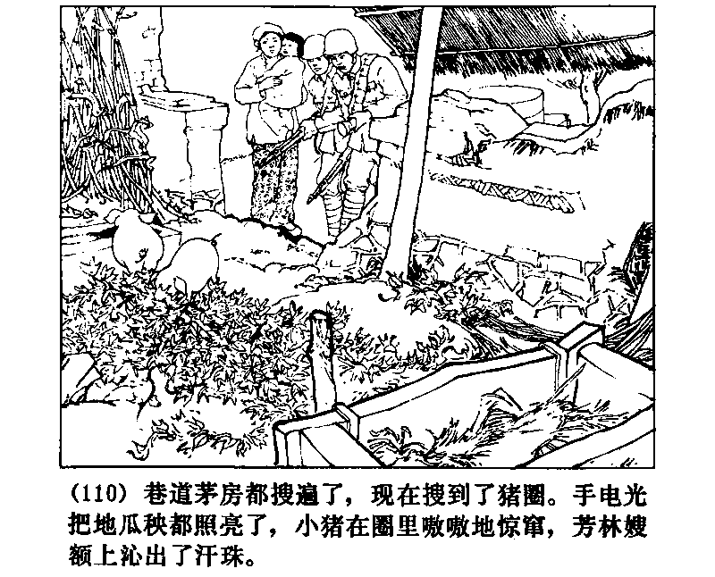 溝や便所ももれなくさがしまわり、今は豚の囲いをさがしている。懐中電灯はイモの苗をくまなく照らしていた。囲いのなかの子豚はブーブーあばれまわっていた。