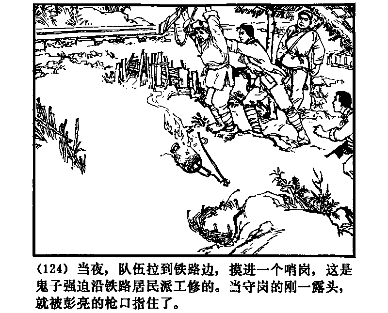 その夜、隊員たちは線路の脇にあつまり、一人の見張りにしのびよった。これは鬼子に強制されて修理にきた沿線の住民だった。見張りは姿をみせるやいなや、彭亮に銃口をつきつけられた。