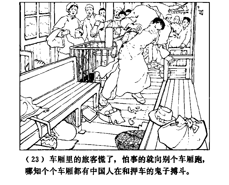 車両の旅客は動揺した。まきぞえになるのをおそれた人たちは別の車両に逃げたが、どの車両でも中国人が車両警備の鬼子と格闘していた。