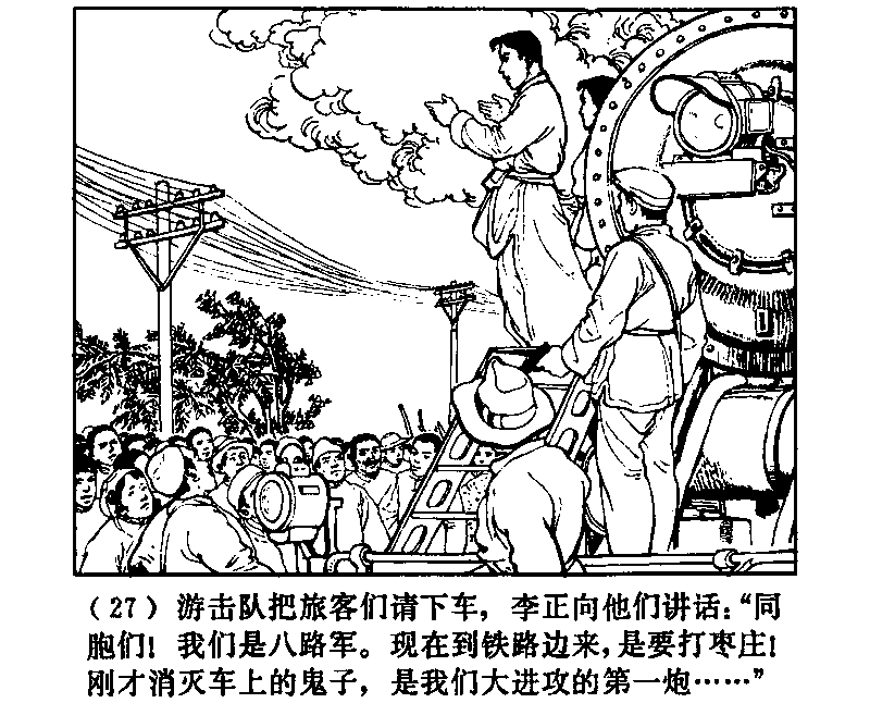 「同胞たちよ!われわれは八路軍だ。現在鉄道周辺に来ているのは、棗荘を攻撃するためだ!さきほど車両上の鬼子を消滅させたのは、我々の大進攻の第一砲だ!」