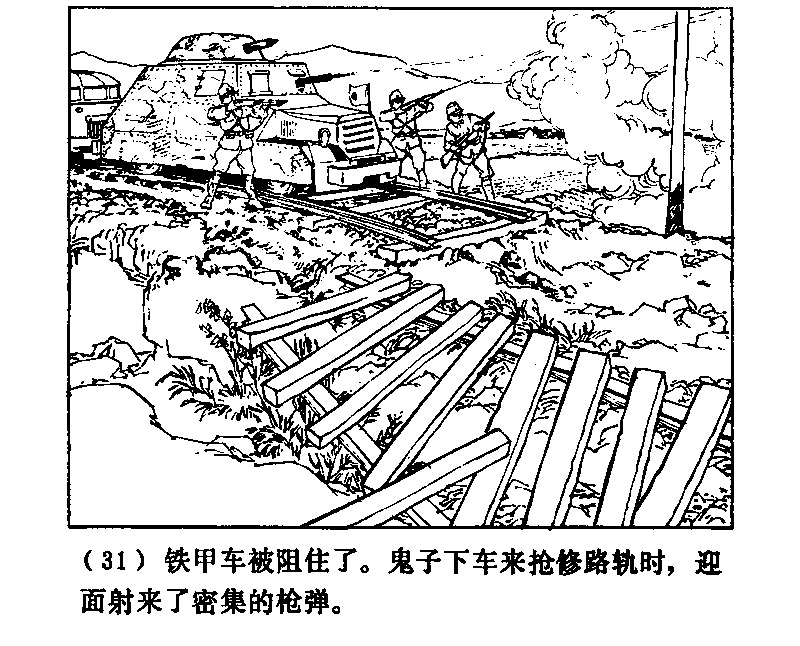 装甲車の行く手ははばまれた。鬼子が降りて線路を直そうとしているところへ銃弾が集中してあびせられる。
