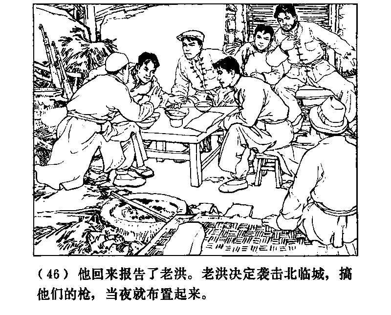 彼は帰って老洪に報告した。老洪は北臨城を襲撃して鬼子たちの銃をうばうことを決定し、その夜準備をした。