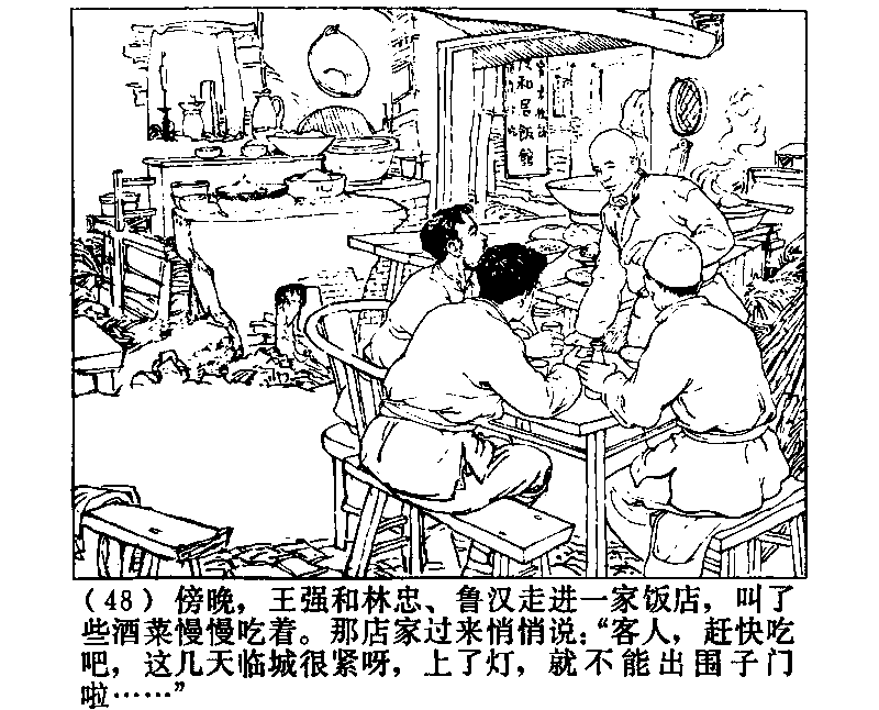 夕方、王強と林忠・魯漢は飯屋にはいり、酒と料理をたのんでゆっくり食べていた。そこへ店主がやってきてひっそりと言う。