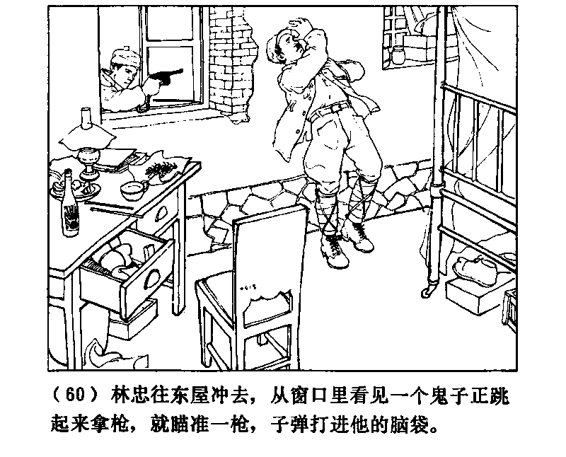 林忠が東の建物に向かって突進すると、鬼子が銃をとりだそうとしているのが窓から見えたので、狙いをさだめて一発、タマは鬼子の頭に命中した。