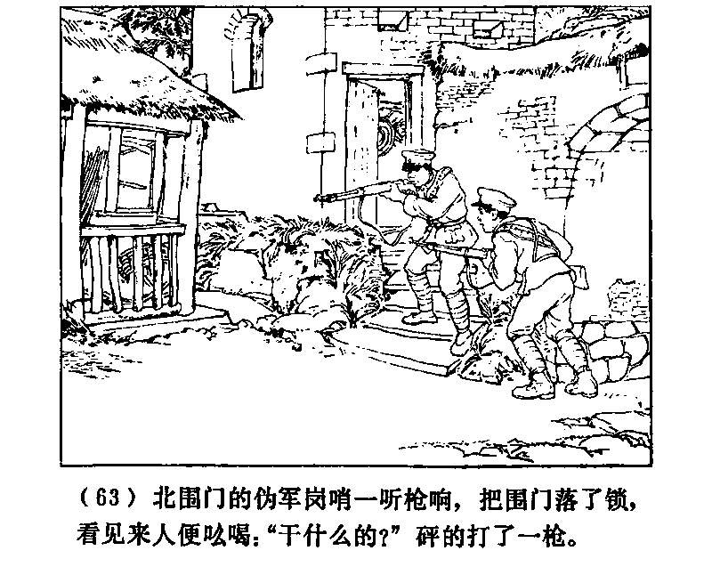 北城門の偽軍の守兵は、銃声を聞くと、城門に鍵をかけ、やってくるのを見ると大声で「何する者だ!」と叫び、パンと一発銃を放った。