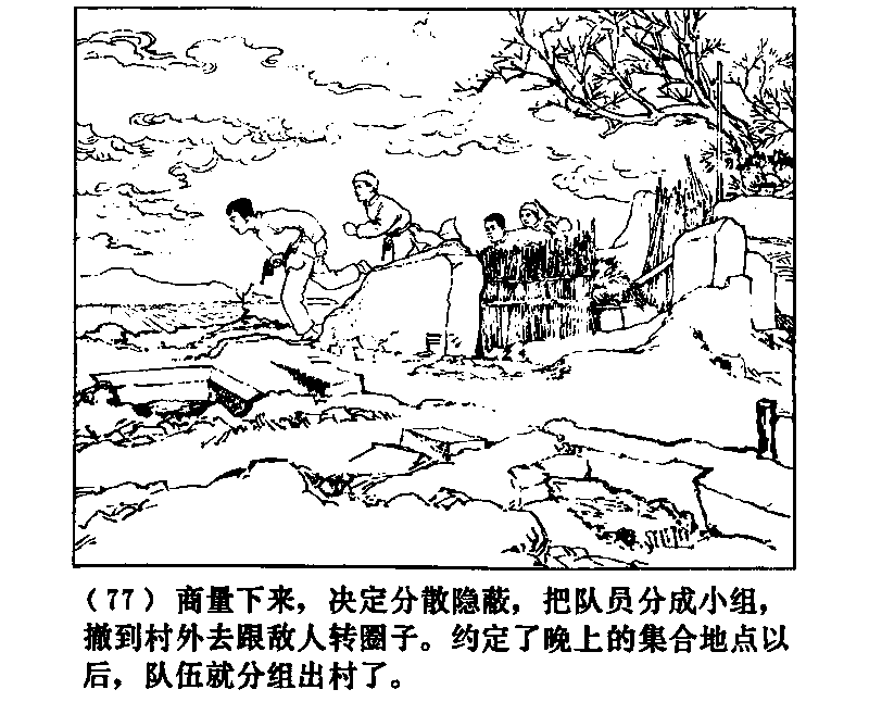 相談の結果、分散して隠れることに決まり、隊員を小隊に分けて村の外へ撤退し、敵を避けることにした。夜の集合地点を決めたあと、小隊にわかれて村を出た。