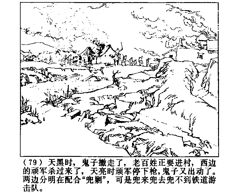 空が暗くなると、鬼子が撤退し、普通の人たちが村に入ろうとすると、西の頑軍が殺到する。空があかるくなると頑軍は銃をおさめ、鬼子がまた出てくる。両軍はあきらかに役割分担して「包囲掃討」していたが、しかしどれだけ包囲しても鉄道遊撃隊をみつけることができなかった。