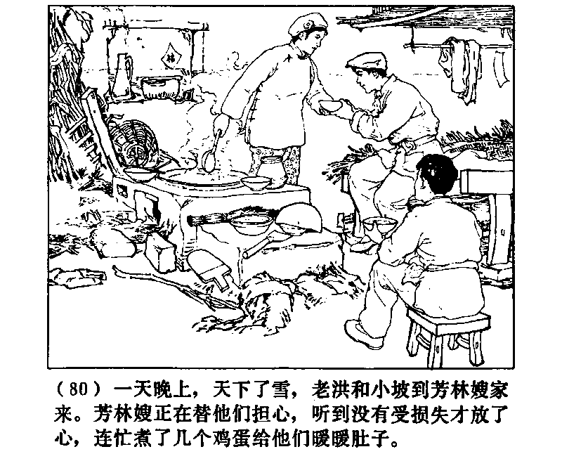 その夜、雪が降るなか、老洪と小坡は芳林嫂の家をおとづれた。芳林嫂はちょうどかれらのことを心配していたところで、被害をうけていないと聞いてやっと一安心し、いそいで卵をゆで、彼らの腹を暖めてやった