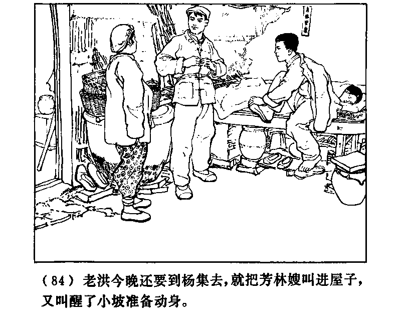 老洪はその夜,楊集にまで行く必要があった。芳林嫂を中によびいれ、小坡を起こして出発の準備をした。