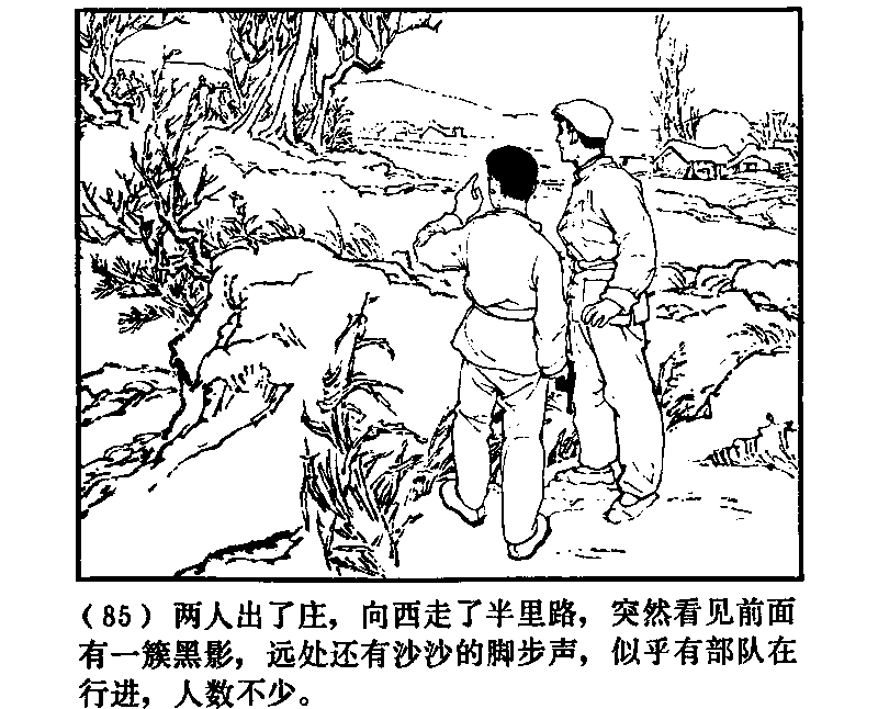 二人が村を出、西に半里ばかり進むと、いきなり前の方に一群の黒いものがみえた。ザッザッという足音もきこえ、まるで部隊が行進しているようで、その音からすると人数は少なくない。