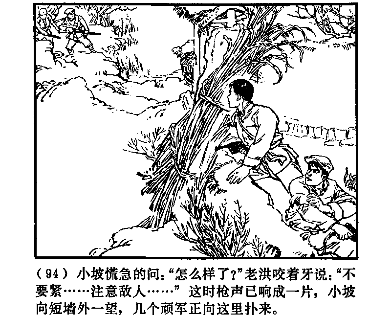このとき既に銃声があつまってきた。小坡が低い塀から外を眺めると、数人の頑軍がここへ向って突き進んでくる。
