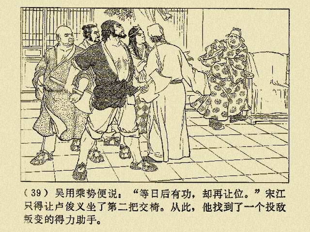 呉用はその情勢にあわせて言うよう、「後日の功績を待って、また位をゆずられては」 宋江は盧俊義を第二位の席に座らせるしかなかった。これより、敵に投じ反乱を変質させるための強力な助手がみつかった(ということだ)。