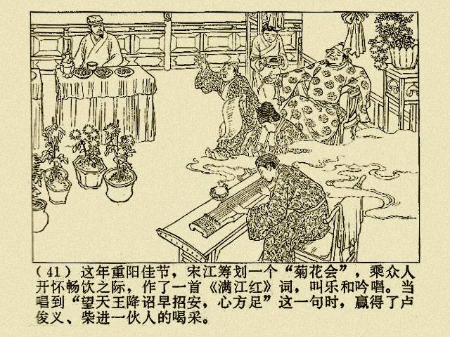 この年の重陽の節句(※1)、宋江は「菊花会」を開催した。宴たけなわとなったころ、一首の「満江紅」の詞(※2)をつくり、楽和に歌わせた。「望むらくは天王すみやかに招安の詔書をくだし、心まさに足ることを (皇帝陛下、はやく招安の命令をだして、私の心をみたしてください)」この一句に歌い至ったとき、盧俊義、柴進らの一味からの喝采を得た。