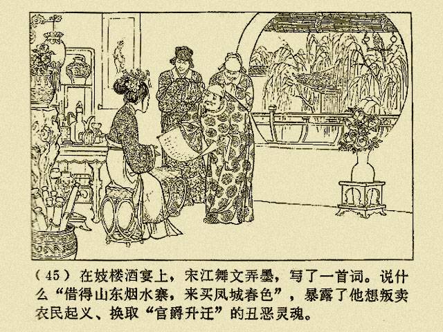 妓楼の酒宴では、宋江は墨をもてあそんで一首の詞を書いた。なんといっているのか。「山東の烟水寨を拝借し、鳳城の春色を買いに来た」これは農民起義をうりとばし、「立身出世」ととりかえようという醜悪な霊魂を暴露している。