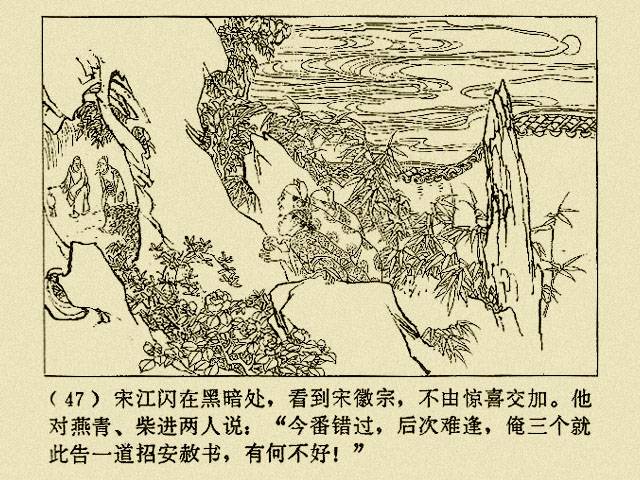宋江はとっさに暗がりへ潜んだが、徽宗皇帝が来たのをみて、驚きと喜びがまきおこるのをおさえられなかった。燕青と柴進の二人に言うよう、「ここでしくじったら、つぎはもうないぞ、おれたち三人がここで招安の詔書のことを言ってしまえば、それでいいじゃないか!」