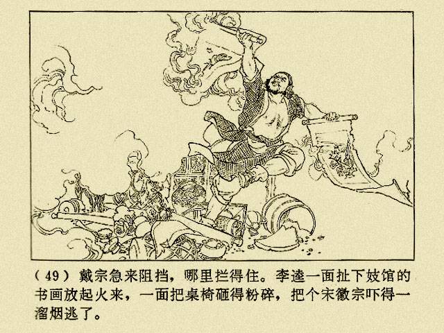戴宗があわてておさえにかかったが、どうしておさえきれよう。李逵は妓館の書画に火をかける一方で、机や椅子をこなごなにこわしたので、宋徽宗はびっくりして雲を霞と逃げてしまった。