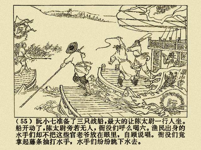 阮小七は三艘の戦船を出し、いちばん大きいものに陳太尉らの一行を座らせた。船が出発すると、陳太尉は傍若無人にふるまいだし、その下役たち(※)はバクチをやりだした。漁民出身の水手たちはこのお役人さまたちには目もくれず、勝手に歌いだした。下役たちはついに藤のムチで水手を打ちだしたので、水手たちはバラバラと水のなかに飛びこんでいった。