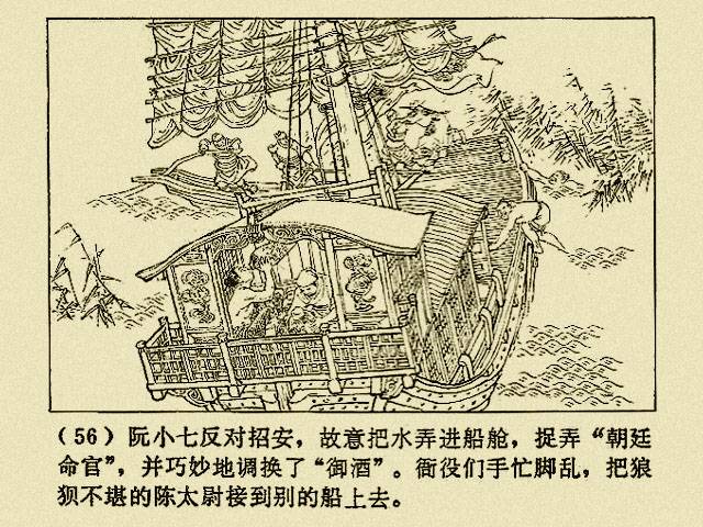 阮小七は招安に反対で、わざと船に水を漏らせた。「朝廷の使者」をなぶり、それと同時にたくみに「御酒」をスリ替えようというのである。下役たちは手足をバタバタさせてあわて、狼狽している陳太尉を違う船にのせて先へ行った。