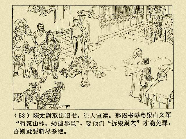 陳太尉は詔書をとりだし、人に宣読させた。その詔書では梁山の義軍を「山林にたてこもって町や村を略奪し」と侮辱し、かれらが自ら「巣穴をこわせ」ば罪をゆるしてやるが、そうしなければみなごろしにして絶えさせる、とのことだった。
