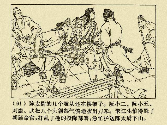 陳太尉のとりまきはなおいばりちらしていたので、阮小二、阮小五、劉唐、武松など数人の頭領はみな腹をたてながら刀を抜いた。宋江は朝廷の使者になにかおこってしまうのをおそれ、その投降部門を乱しながら、いそいで陳太尉を護送して下山した。