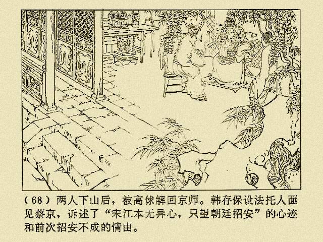 両人は下山したあと高俅によって都へ押送された。韓存保はなんとか策をねり人にたのんで蔡京に会ってもらい、「宋江には異心なく、ただただ朝廷の招安をのぞんでいる」という内情と、前回の招安が成功しなかった事情をつたえた。