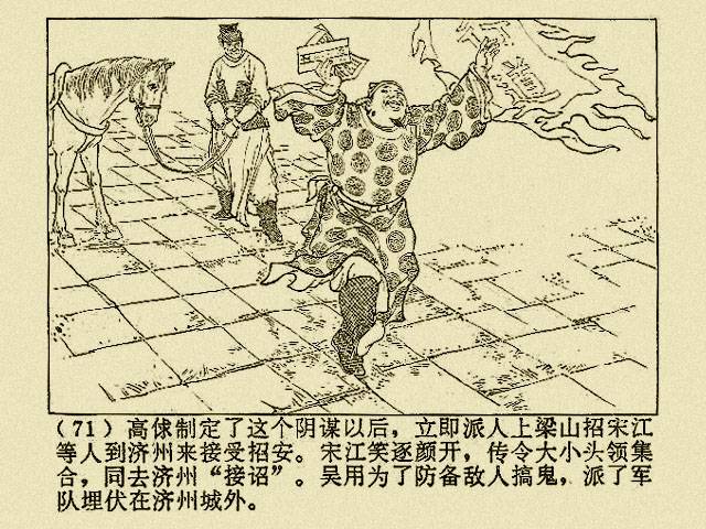 高俅はこの陰謀をしくんだあと、すぐに梁山に人を出し、宋江らは済州にきて招安を受けるようつたえた。宋江は笑いのあまり顔がゆるみながら、大小の頭領に集合をつたえ、いっしょに済州にいって「詔を受ける」ことにした。呉用は敵のわるだくみに備え、軍隊を派遣して済州城外に伏兵させておいた。