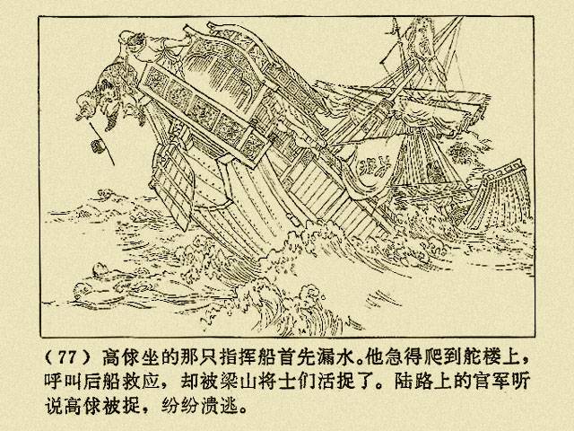 高俅ののっていた指揮船がまず水が漏れた。あわてて船の舵楼の上によじのぼり、後続の船にたすけをもとめたが、梁山の手勢にいけどられてしまった。陸路の官軍は高俅がいけどられたと聞いて、バラバラに潰走した。